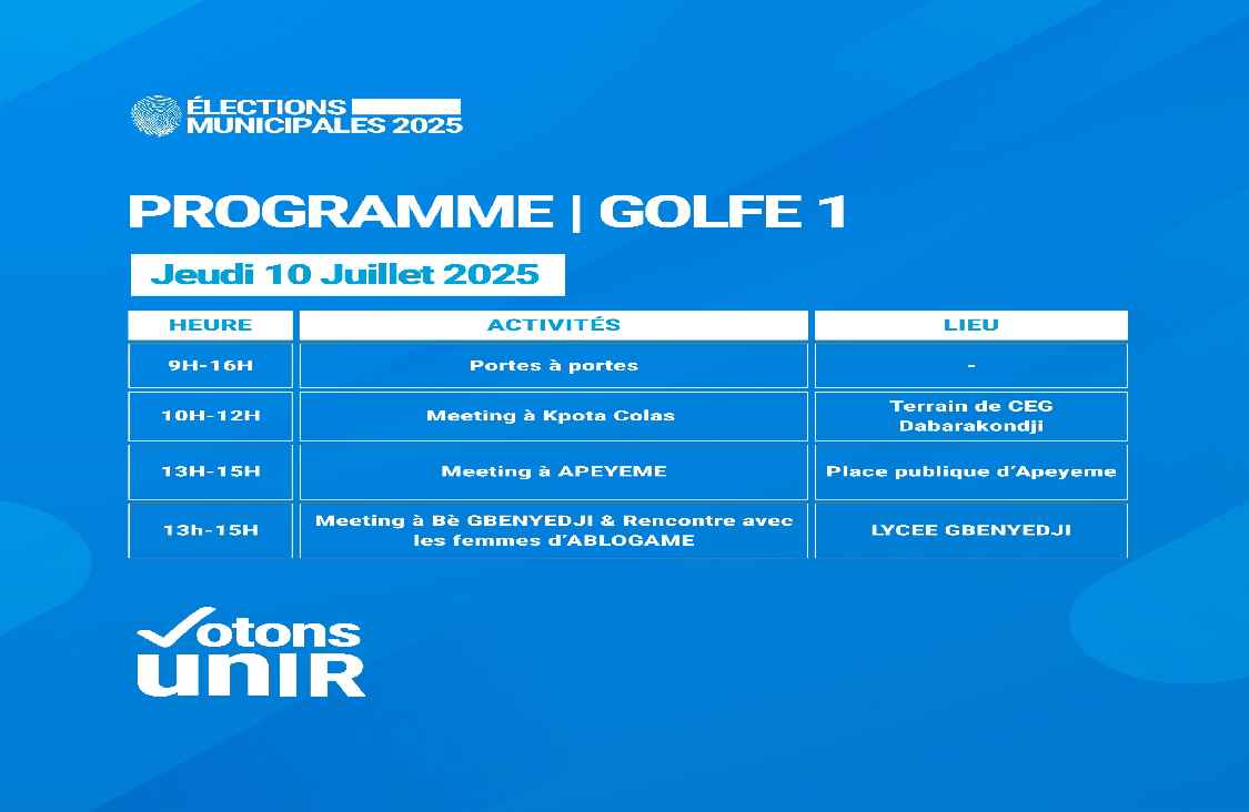 À l’approche des municipales du 17 juillet 2025, le moteur électoral du parti Union pour la République (UNIR) tourne à plein régime, porté par une dynamique de terrain que rien ne semble pouvoir freiner. Le 10 juillet, c’est le Lycée Gbényédji, cœur battant de la commune Golfe 1, qui s’est transformé en agora populaire, accueillant […]